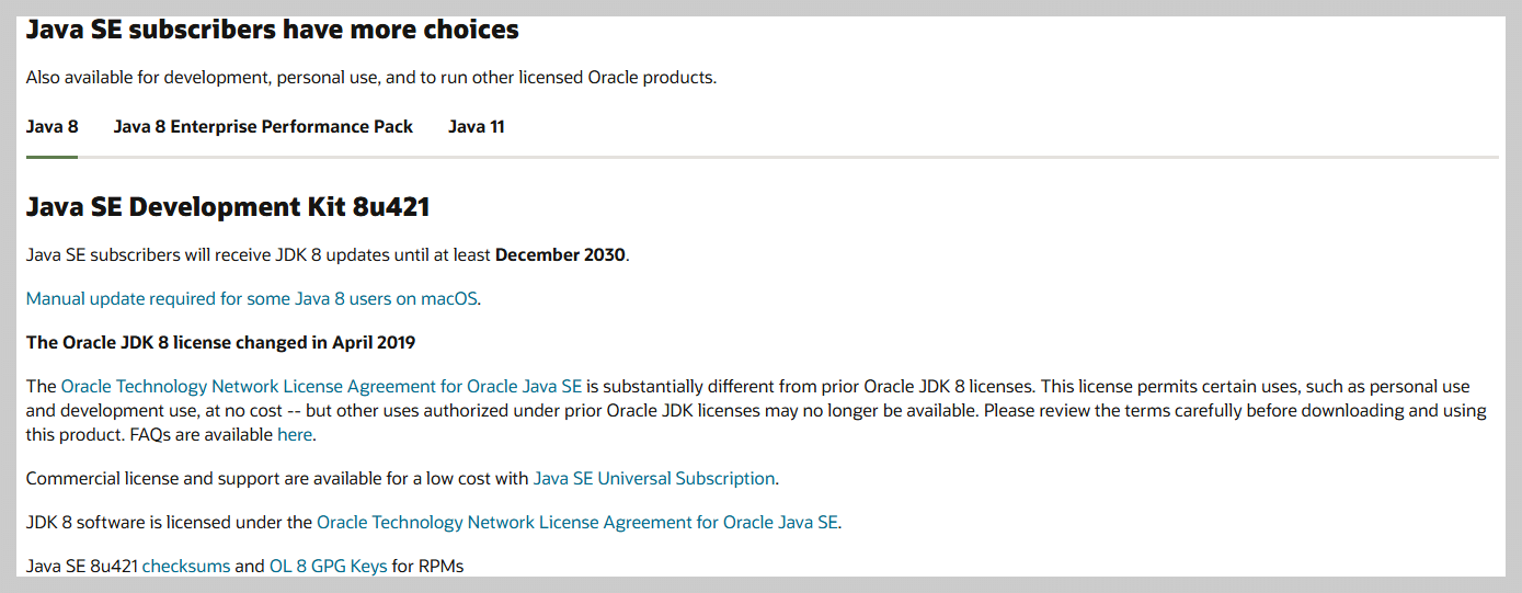 참고로 현재 글을 작성하는 2024년 9월 기준으로 최신 버전은 Java 8 update 421 버전이다.