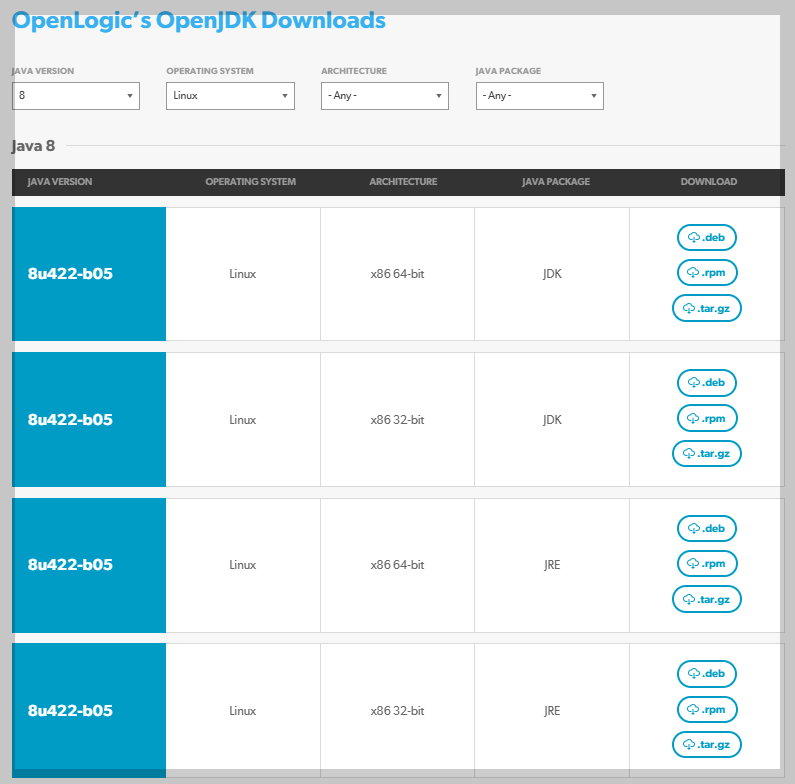 1. OpenLogic 싸이트에 접속해서 Java 8 버전으로 이동한다.