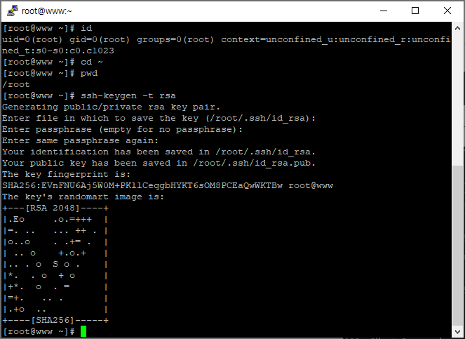 Enter file in which to save the key (/root/.ssh/id_rsa): <-- 키 파일 위치 : 그냥 Enter키를 누른다