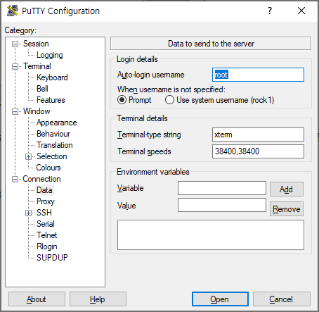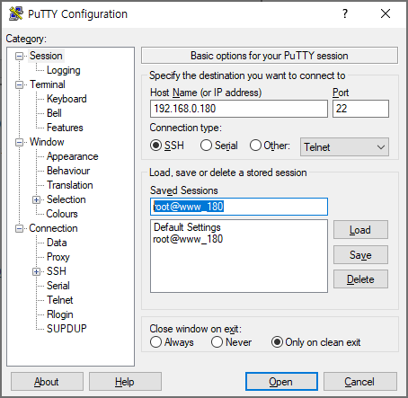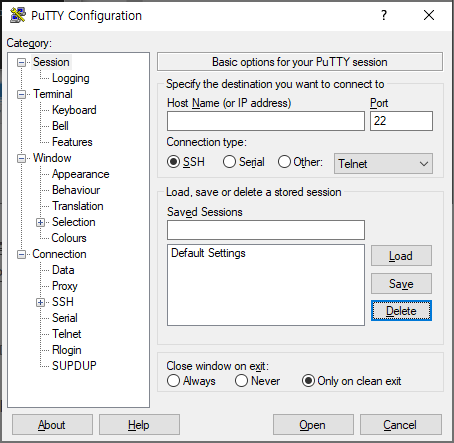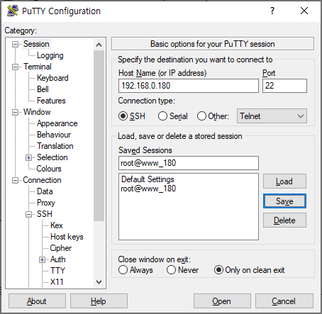 먼저 putty 를 실행하면 "PUTTY Configuration" 화면이 보여진다.
