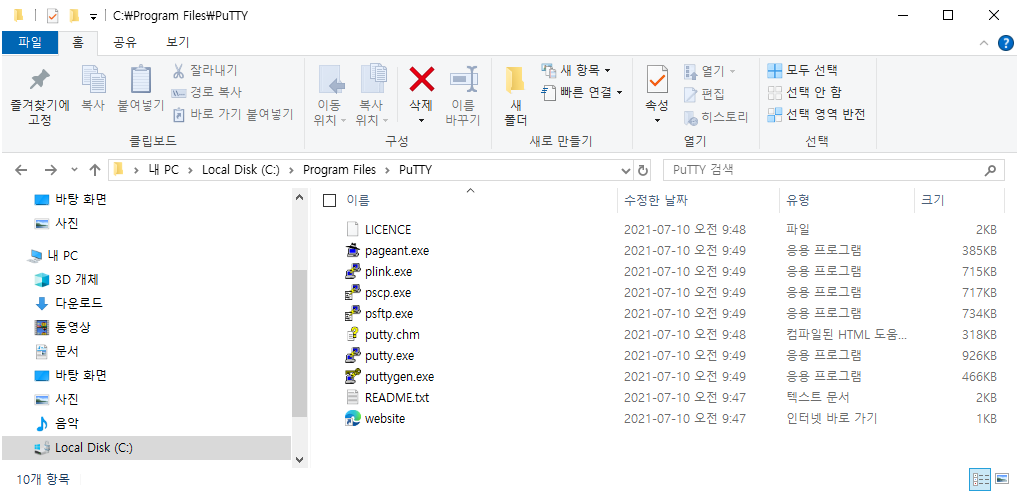 puttygen.exe 를 실행시키기 위해서 putty.exe파일이 있는 설치디렉토리로 이동한다.
