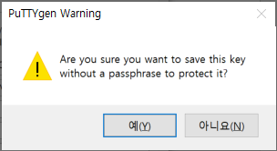 그러면 password가 없이 키 파일을 저장할 건지 물어보는 팝업이 뜨는데, "예"를 눌러준다.