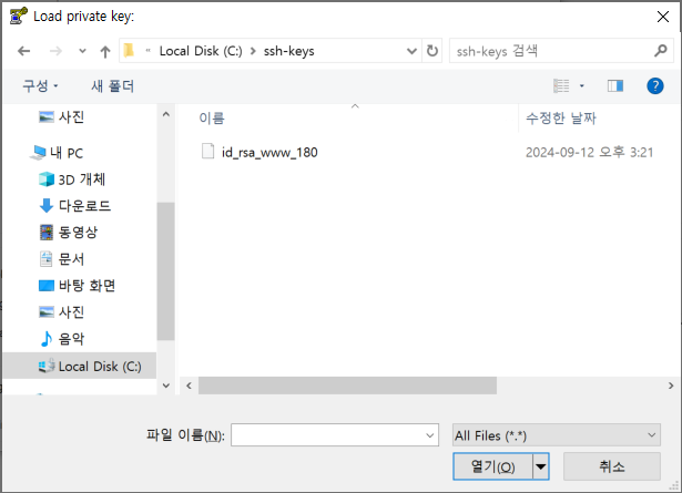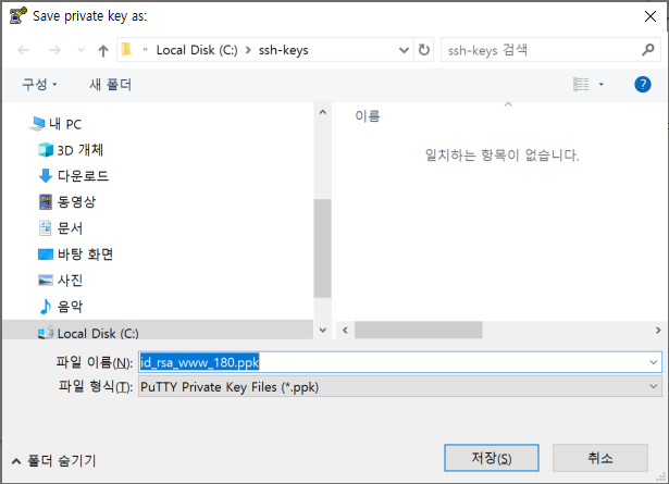 편의상, id_rsa_www_180 이라는 파일명과 동일하게하게, 뒤에 확장자로 .ppk를 붙여 입력한다.