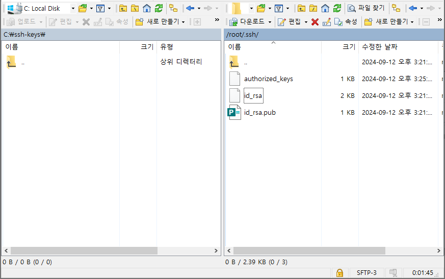 FTP 프로그램을 이용해서 id_rsa 개인키 파일을 로컬 컴퓨터로 다운로드 한다.
