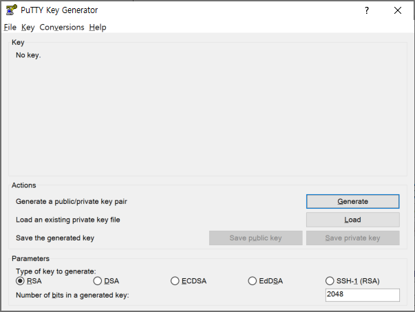 3. puttygen.exe 파일을 실행시켜 putty 형식의 key파일로 변환한다