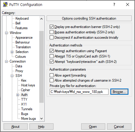 왼쪽 메뉴에서, Connection -> SSH -> Auth 메뉴를 클릭한다.